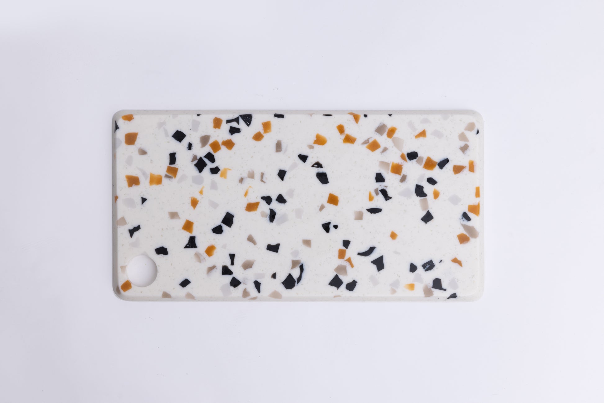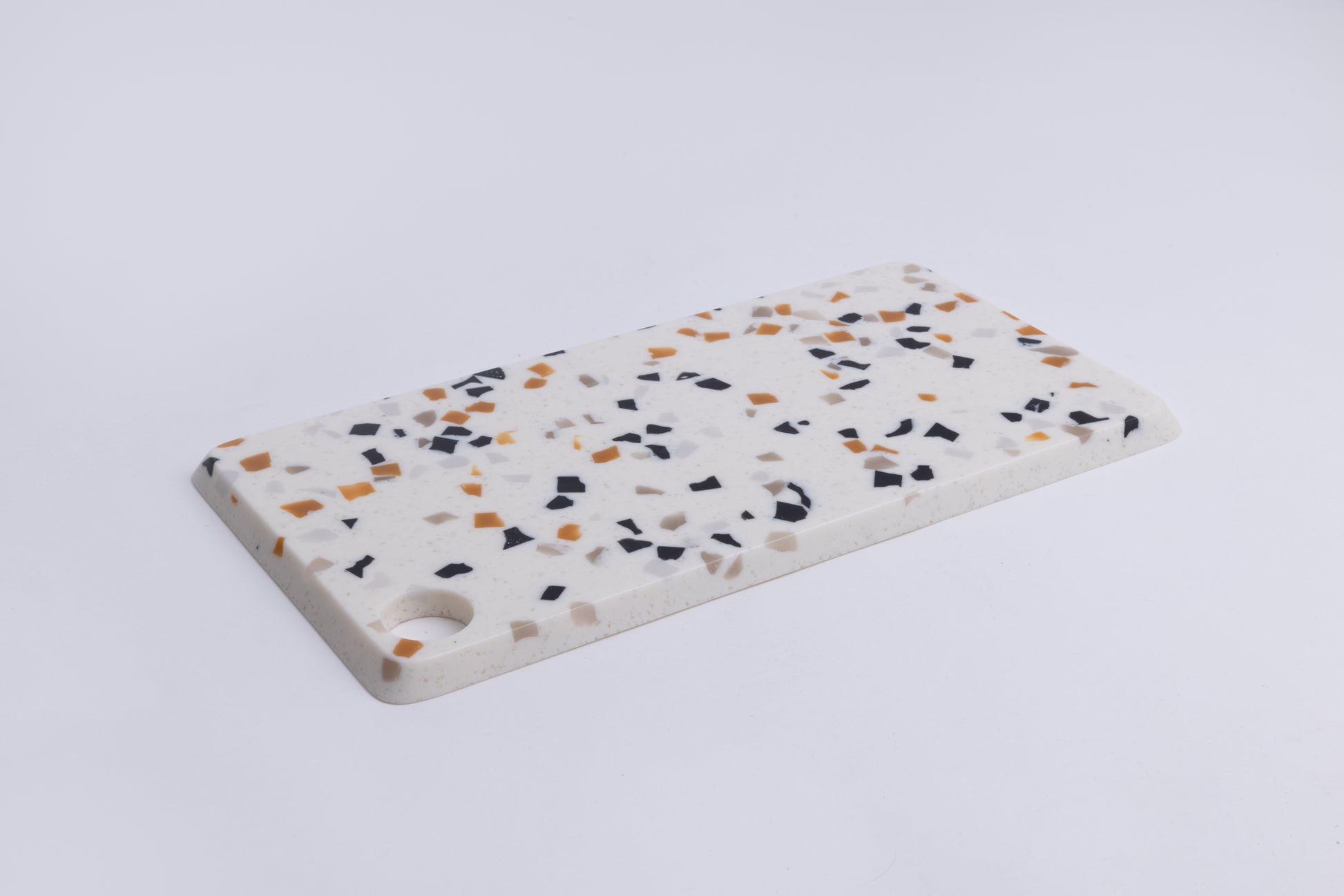It can be used as cheese board or cutting board made from Corian into a terrazzo style of crushed stones is our new signature style of kitchen ware and serve ware.