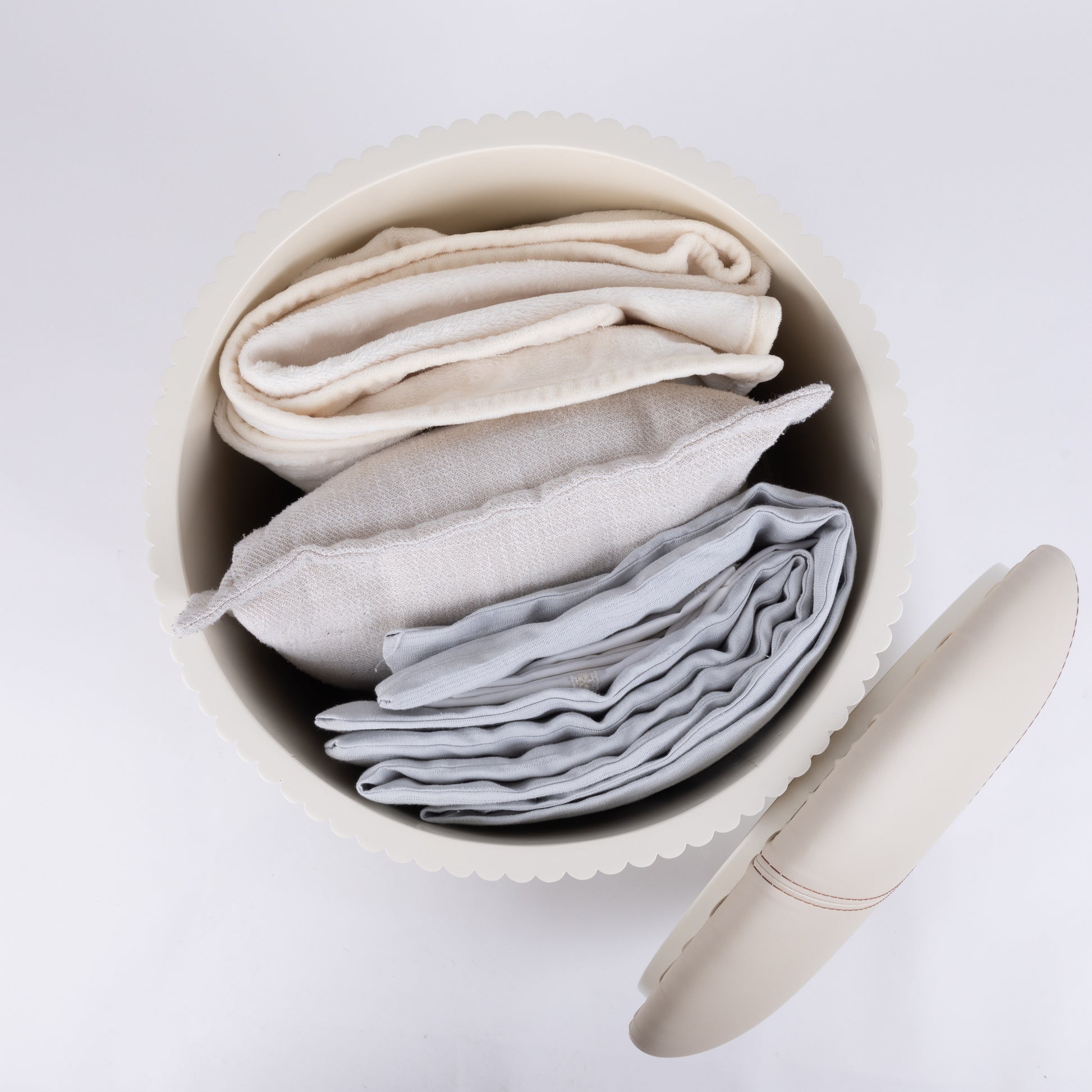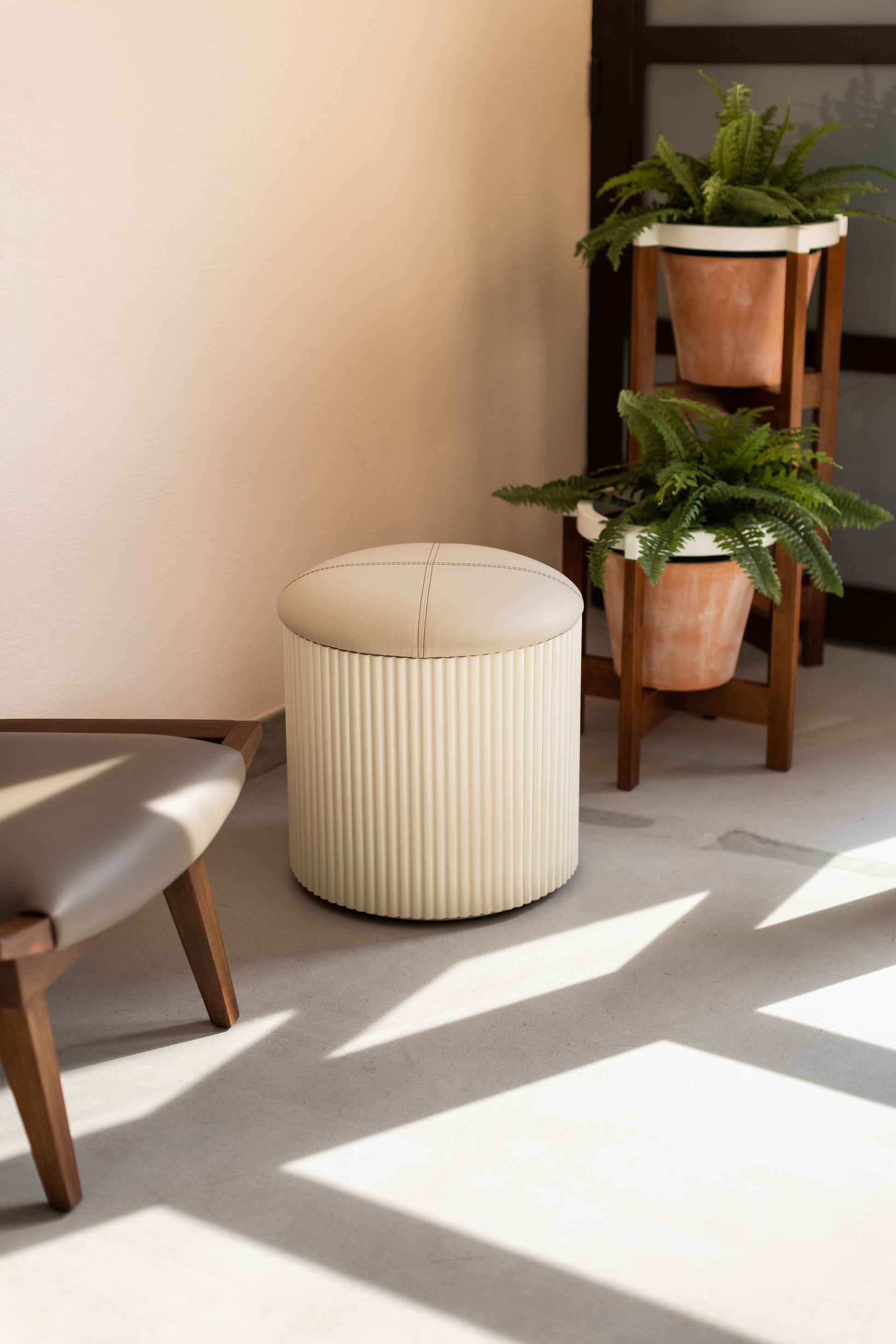Transform your living room into a cozy and stylish space with the Off-white Fluted Storage Pouf. It is a three in one: seat, storage and ottoman when needed.