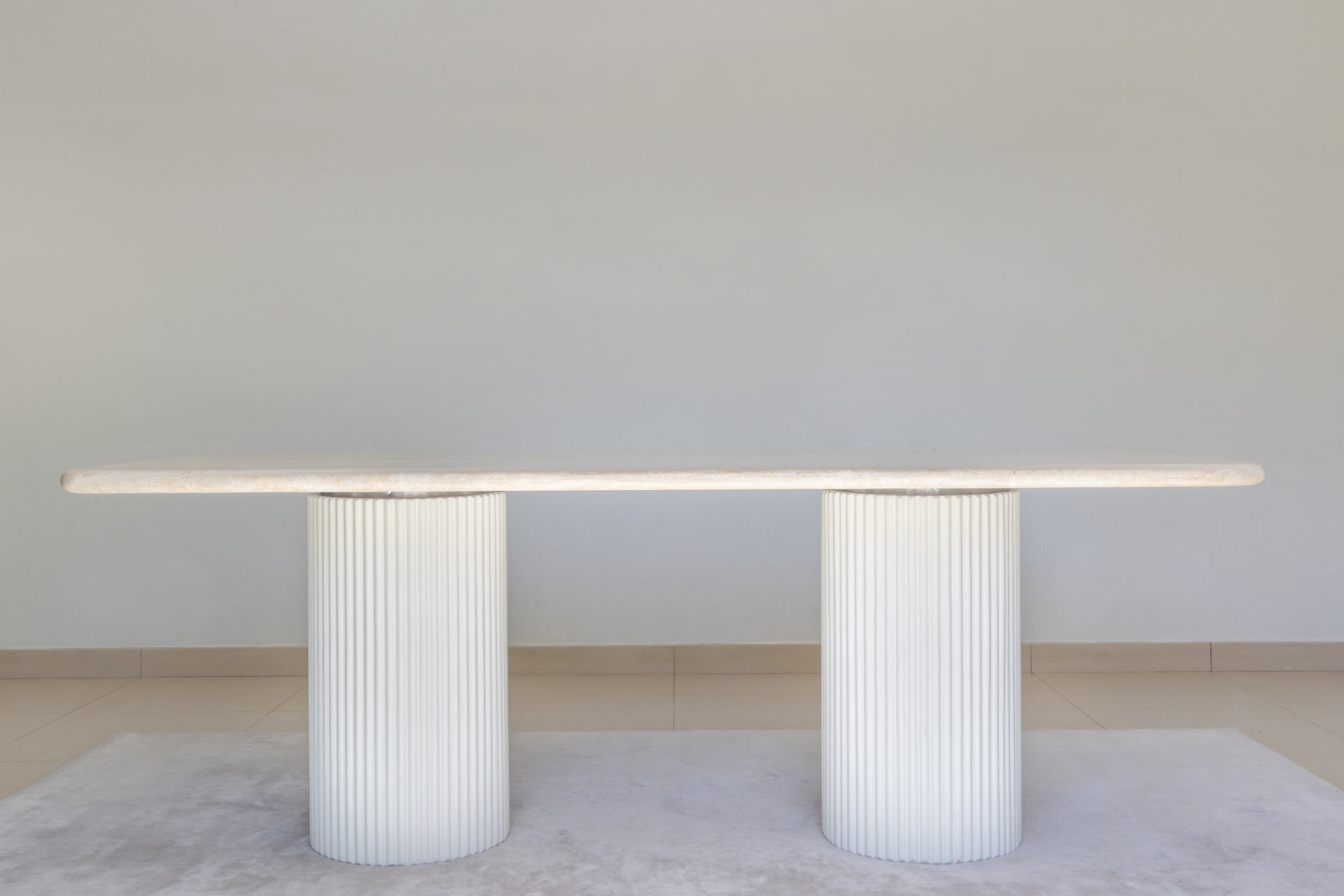 Elevate your dining experience with the Riwaq Fluted Pedestal Dining Table, a seamless blend of modern elegance and timeless design. Featuring a smooth, rectangular tabletop crafted from light-toned stone with softly rounded edges, this table brings a sense of sophistication to any space. The twin fluted pedestal bases, finished in a creamy white tone, that echo the linear geometry of classic riwaqs add architectural interest and a sculptural feel, making this piece as much an art statement as a functional centerpiece.